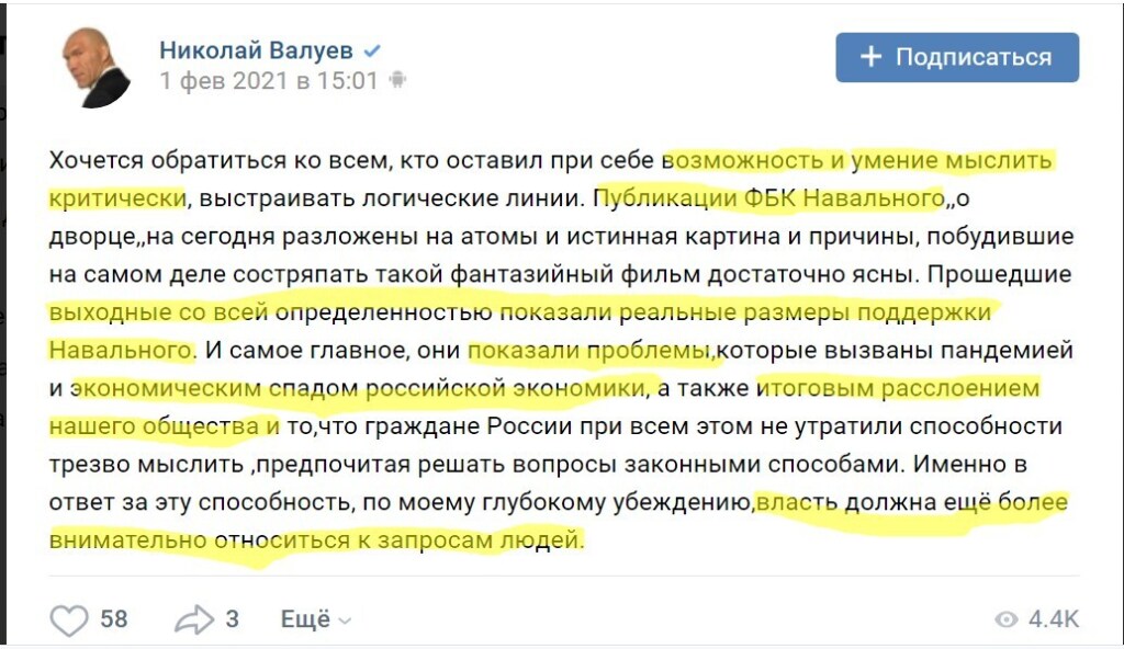 Хотя, некоторые признаки симпатий к Навальному и завуалированная пиар-поддержка эксглавы оппозиционной организации ФБК**, признанной иностранным агентом, на мой взгляд, давно присутствуют на страничке Валуева ВКонтакте.