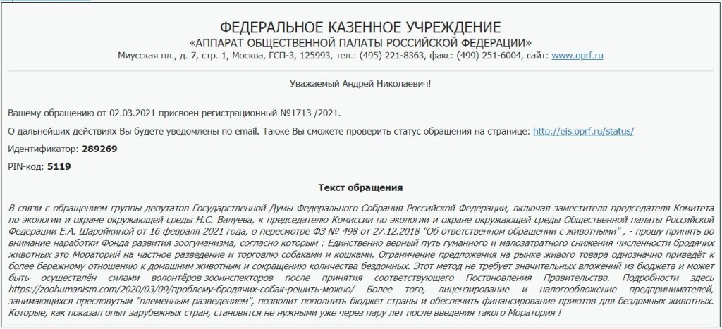 Обращение зоогуманистов официально принято и зарегистрировано.