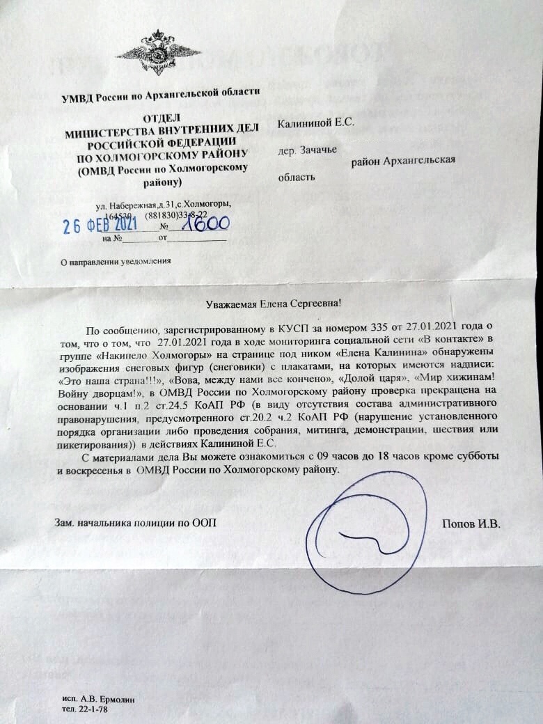 Активистка Елена Калинина получила ответ из ОМВД России по Холмогорскому району Архангельской области, что проверка по заявлению о митинге снеговиков (КУСП№335 от 27 января 2021 года) прекращена в виду отсутствия состава административного правонарушения, предусмотренного статьёй 20.2 часть 2 КоАП РФ.