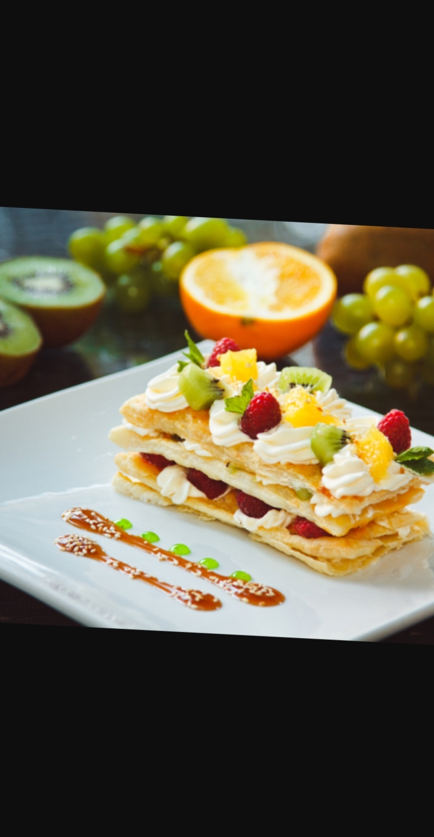 Посыпать сахарной пудрой один прямоугольник слоеного теста, выложить его на тарелку, сверху крем с виски, затем накрыть еще одним прямоугольником.