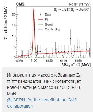 Российские ученые из МФТИ, МИФИ и ФИАН, работающие в составе международной коллаборации CMS (англ. Compact Muon Solenoid) на Большом адронном коллайдере в ЦЕРН, объявили об обнаружении новой элементарной частицы. Впервые открыто орбитальное возбуждение (резонанс) Ξb (6100)– прелестно-странного бариона. Оно распадается на основное состояние Ξb– («кси бэ минус барион») и два пи-мезона противоположных зарядов. В работе были использованы данные протон-протонных столкновений, набранные на Большом адронном коллайдере в 2016–2018 годах. Препринт статьи находится на рецензировании в журнале Physical Review Letters.