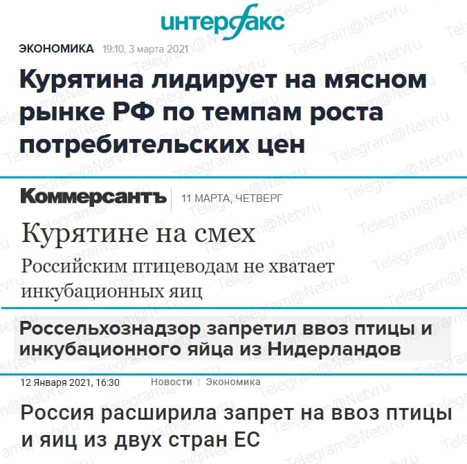 Ведь большинство птицеферм не предусматривало и не предусматривает наличия материнского поголовья. Яйца практически все импортные... Как теперь с Китаем будем решать вопросы неустоек? Зато на всех перекрёстках орут, что РФ стала экспортёром мяса птицы! Всё, шарик сдулся?
