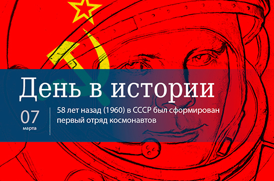 7 марта 1960 года в СССР был сформирован первый отряд космонавтов, состоявший из 12 военных летчиков: Ивана Аникеева, Валерия Быковского, Бориса Волынова, Юрия Гагарина, Виктора Горбатко, Владимира Комарова, Алексея Леонова, Григория Нелюбова, Андрияна Николаева, Павла Поповича, Германа Титова и Георгия Шонина.