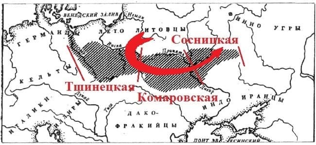 Дело в том, что Тшинецкая культура (праславян, отступивших из западной Белоруссии под напором балтов), Комаровская культура (её раннее, припятское крыло) и Сосницкая культура (поднимавшаяся вверх по Десне и Сейму) это… звенья одной культуры 19−11 веков до н.э. Родство этих трех культур слишком очевидно и не оспаривается. Вот эту дугу, охватившую балтов с юго-запада, юга и юго-востока и следует, видимо, считать прародиной славян. Точнее, здесь 4−3 тыс. лет назад протославяне стали праславянами — группой племен со схожей культурой и взаимопонятными языками. До того, чтобы избавиться и от приставки «пра» — стать славянами, осознающими свое единство, было еще далеко. Но вскоре, возможно, появилось их первое… государство.