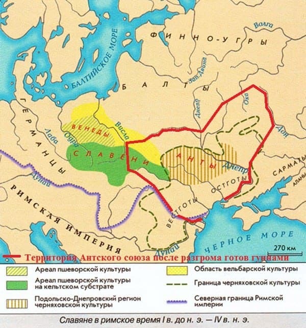 А теперь самое важное в этой части. Есть несколько примеров, когда в границах одного государства народ, формировавший элиту, передавал свое имя всему населению через название государства: Франция, Болгария, Русь, Украина («украинцами» первоначально поляки называли магнатов и щляхту, получивших земли юго-западной Руси, отнятые у Литвы в результате Люблинской унии 1569 года). Но, насколько нам известно, нет ни одного случая, когда название передавалось бы «просто так», «по соседству», вне границ единого государства. Т. е. германцы и славяне, принявшие имя венедов — соответственно «вандалы» и «анты» — находились в составе единого с венедами государства. Учитывая славянизацию венедов, господствующих в этом государстве, можно сказать, что государство балтийских венедов это второе славянское государство (после «царства» будинов). Понятно, отношения Польши и России сегодня таковы, что впору обвинять друг друга в истреблении неандертальцев, но взаимодействие историков двух государств дало бы позитивный результат.В начале 3-го века готы разгромили сарматов и утвердились в Северном Причерноморье, основав государство, которое Иордан называет Ойум («Страна вод»). Его границам примерно соответствует Черняховская археологическая культура. К его северной периферии, у «вечных спасительниц» Припяти и Десны и оказались прижаты анты. Карта ниже слишком доброжелательна к ним: анты оказались, скорее, у самого Киева и севернее границ Черняховской культуры. Впрочем, и анты, и готы «нахватались» так много от венедов, что провести чёткую границу между их ареалами сложно.