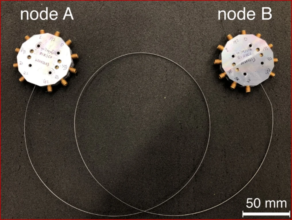 "Исследователи из лаборатории Cleland Lab Чикагского университета создали два квантовых узла, каждый из которых содержит по три сверхпроводящих кубита. Используя сверхпроводящий кабель длиной один метр для соединения узлов, ученые затем выбрали по одному кубиту в каждом узле и запутали их вместе, отправив по кабелю так называемые «запутанные квантовые состояния». Принимая форму микроволновых фотонов, эти запутанные квантовые состояния чрезвычайно хрупки, что делает процесс особенно сложным; но исследователям, тем не менее, удалось передать запутанность от одного узла к другому, соединив кубиты в особое квантовое состояние, которое до сих пор одновременно увлекает и сбивает с толку ученых-квантовиков».