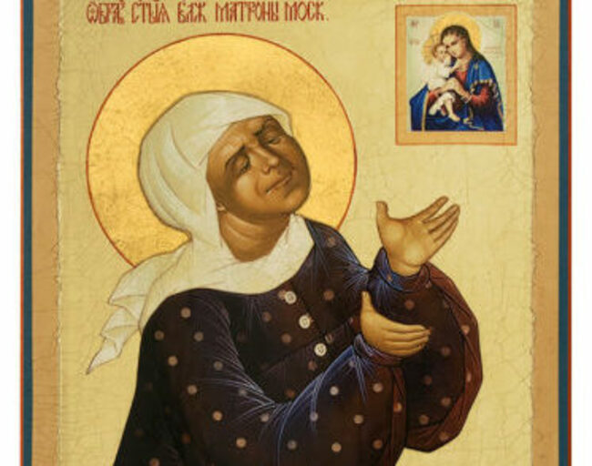 «О блаженная, мати Матроно, услыши и приими ныне нас, грешных, молящихся тебе, навыкшая во всем житии твоем приимати и выслушивати всех страждущих и скорбящих, с верою и надеждою к твоему заступлению и помощи прибегающих, скорое поможение и чудесное исцеление всем подавающи; да не оскудеет и ныне милосердие твое к нам, недостойным, мятущимся в многосуетнем мире сем и нигдеже обретающим утешения и сострадания в скорбех душевных и помощи в болезнех телесных: исцели болезни наша, избави от искушений и мучительства диавола, страстно воюющаго, помози донести житейский свой Крест, снести вся тяготы жития и не потеряти в нем образ Божий, веру православную до конца дней наших сохранити, упование и надежду на Бога крепкую имети и нелицемерную любовь к ближним; помози нам по отшествии из жития сего достигнути Царствия Небеснаго со всеми угодившими Богу, прославляюще милосердие и благость Отца Небеснаго, в Троице славимаго, Отца и Сына и Святаго Духа, во веки веков. Аминь».