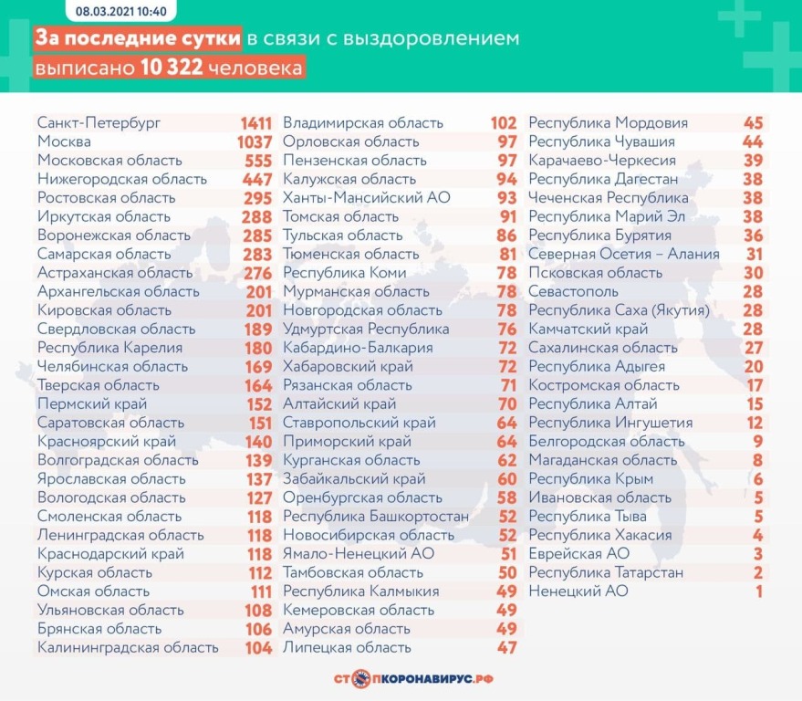 За последние сутки по состоянию на 8 марта 2021 года в России: