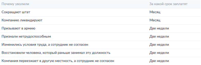 В каком случае выплачивают. Если сотрудник уволен по причинам, не зависящим от него — при ликвидации компании, сокращении штата или из-за призыва в армию.