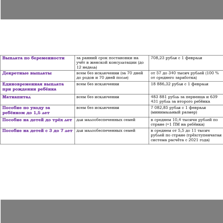 Часть пособий зависит от федерального МРОТ, который с 1 января 2021 года равен 12 792 рубля в месяц (Федеральный закон от 29.12.2020 № 473-ФЗ “О внесении изменений в отдельные законодательные акты Российской Федерации”).