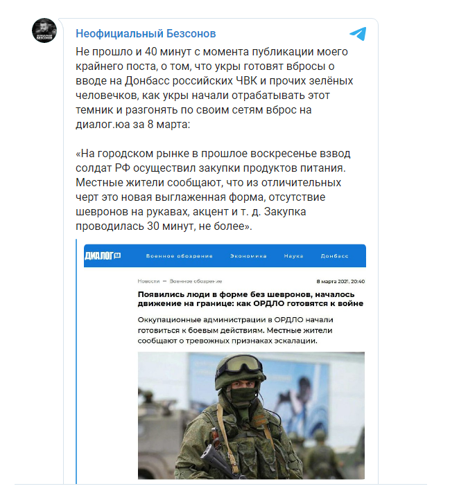 "Не прошло и 40 минут с момента публикации моего крайнего поста, о том, что укры готовят вбросы о вводе в Донбасс российских ЧВК и прочих зелёных человечков, как укры начали отрабатывать этот темник и разгонять по своим сетям вброс", - отмечает он.