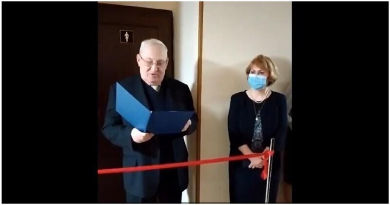Администрация университета на видео с пафосом перерезает красную ленточку у санузла.