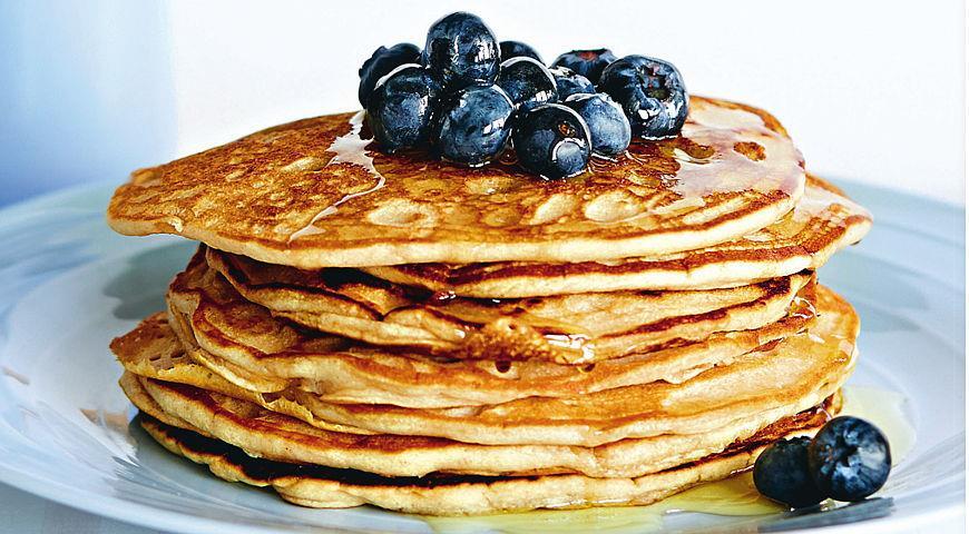 Готовые блины выкладывайте на тарелку и держите в теплом месте. Мед растопите в микроволновой печи. Ягоды вымойте и обсушите. Блины подавайте с ягодами, полив медом.