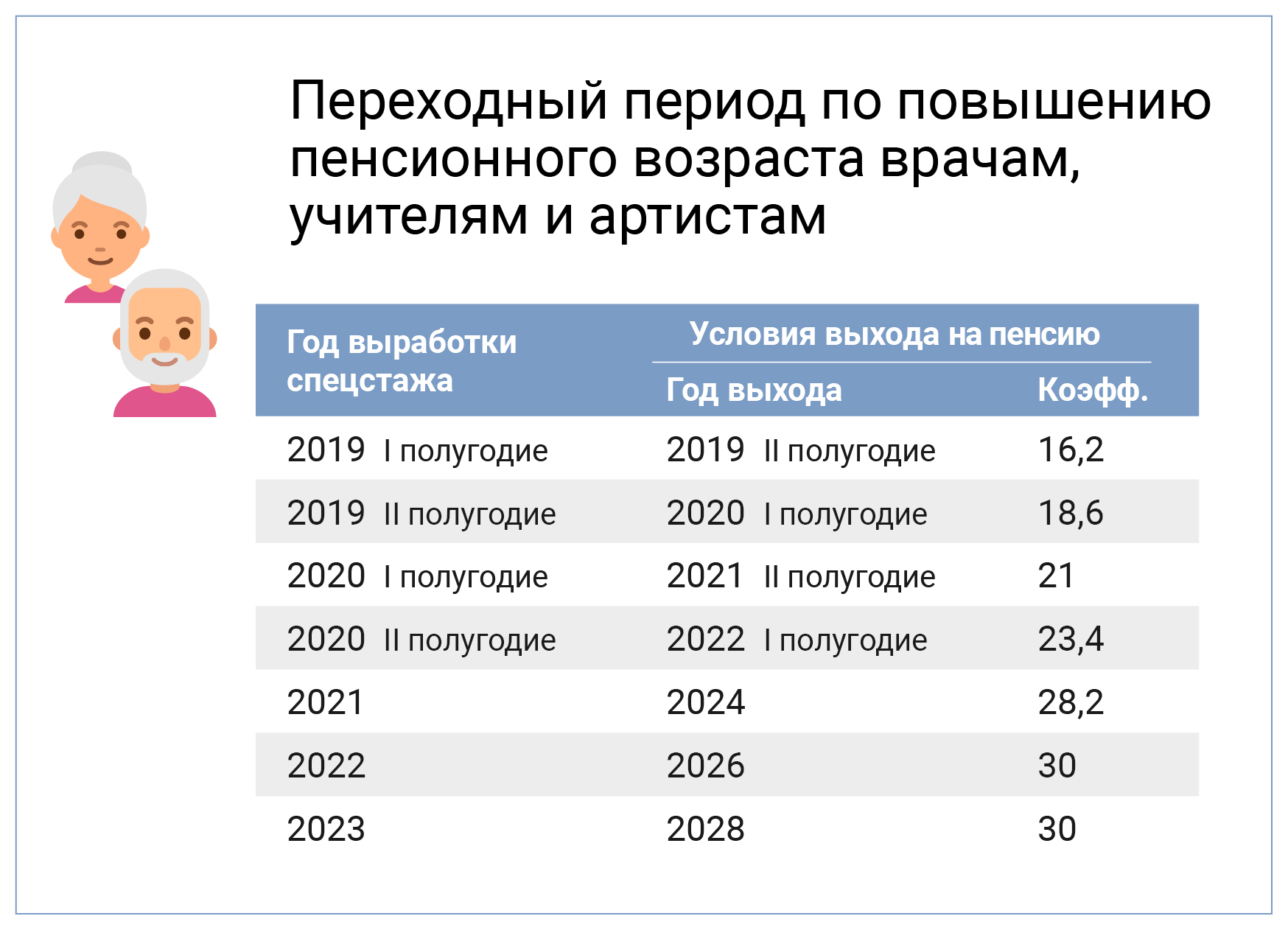 Досрочный выход также сохранился у педагогов, врачей и представителей некоторых творческих профессий, которым выплаты назначаются не по достижении пенсионного возраста, а после приобретения необходимой выслуги лет. Пенсия при этом оформляется с учетом переходного периода по повышению пенсионного возраста, который начинает действовать с момента приобретения выслуги лет по профессии. Например, школьный учитель, выработавший в апреле 2021-го необходимый педагогический стаж, сможет выйти на пенсию в соответствии с переходным периодом через три года, в апреле 2024-го.