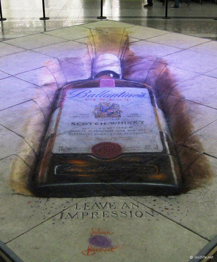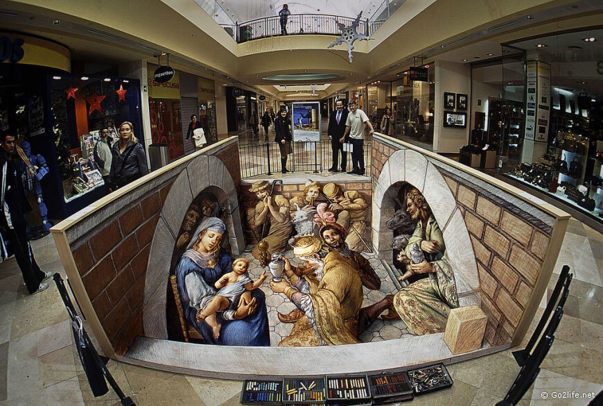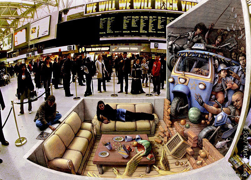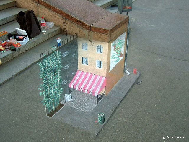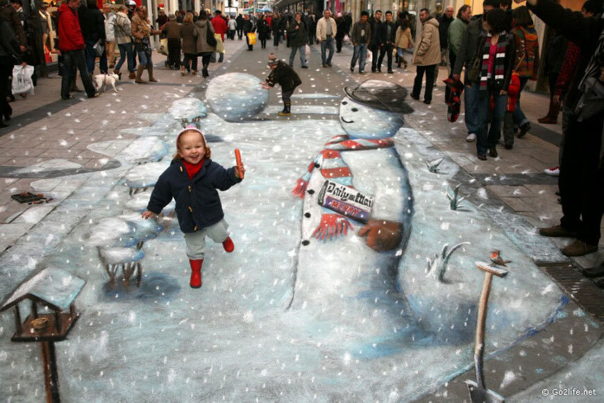 Объемные рисунки на асфальте – это новое веяние прогрессивного искусства, в котором художники применяют для обмана зрения перспективу и определенные углы рисования, под которыми при обзоре рисунка, формируется иллюзия наличия объема. Рисуют такие картины по специально разработанной технологии, благодаря которой картинки на асфальте выглядят словно живые. Одним из самых выдающихся художников на асфальте признан – Курт Веннер (Kurt Wenner), его последние работы произвели настоящий фурор, и он был признан самым выдающимся художником, рисующим масштабные трехмерные 3D картины.