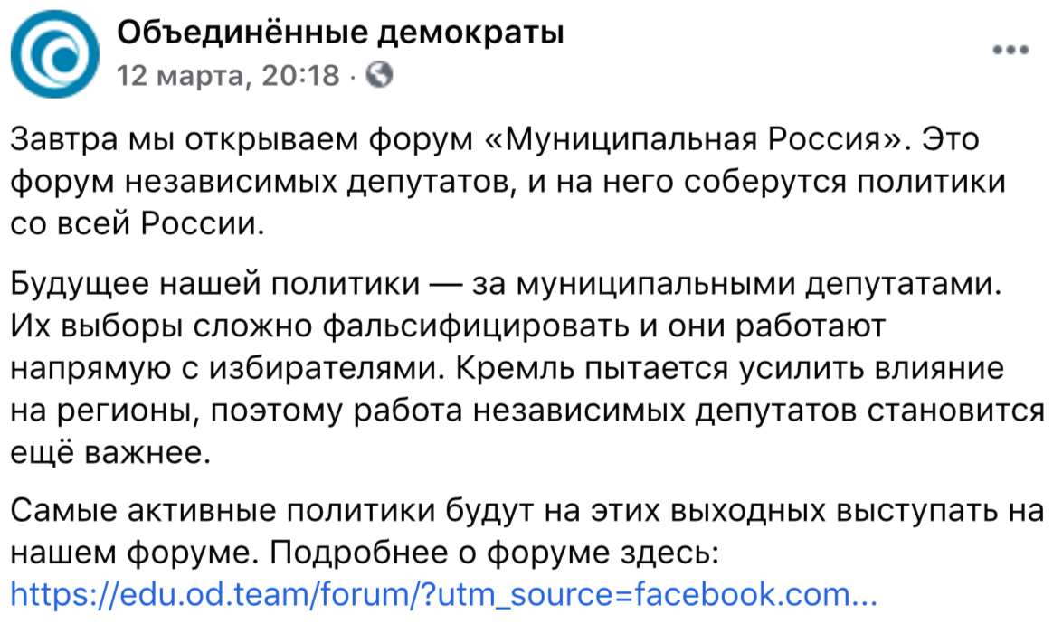 13 и 14 марта в гостинице «Измайлово» в Москве по плану должен был пройти форум независимых депутатов «Муниципальная Россия», который организовала команда платформы «Объединенные демократы». В данном форуме своё участие планировали примерно 200 общественных деятелей из 56 регионов нашей страны. В числе спикеров: