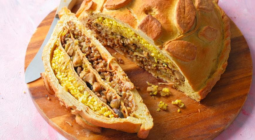 Постная кулебяка хороша со всеми видами крупы, в том числе и с совершенно не свойственными русской кухне. Это могут быть рис - обычный, бурый или дикий, полба или овсяная крупа, булгур млм кускус, амарант или киноа, зеленая гречка или рожь. В качестве "белковой" составляющей вы можете взять не грибы, а бобовые: красную или белую фасоль, любой вид чечевицы или нут. Бобовые должны быть полностью готовы и приправлены солью, перцем и маслом.