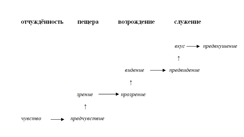 При отчуждённости человек что-то чувствует , в пещере – предчувствует . Там же, в пещере, предчувствие становится зрением, которое при достижении себя превращается в прозрение. Наконец, прозревший человек обретает видение, которое становится предвидением. Появляется вкус к жизни, который оборачивается предвкушением. А предвкушение - то же чувство, но уже на новом витке.