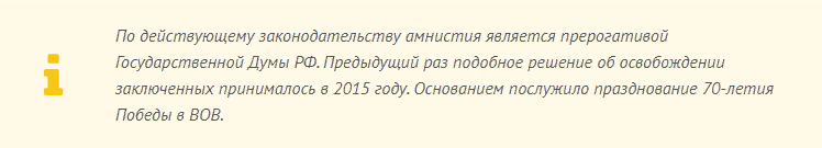В последний раз объявление амнистии состоялось в честь празднования 70-летия Победы в ВОВ в 2015 году. В настоящее время на рассмотрении находится проект документа, предложенный представителями думской фракции ЛДПР. По многим позициям законопроект очень схож с текстом решения от 2015 года, согласно которому обрели свободу 231558 человек.