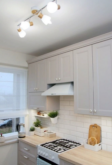 После ремонта рабочая зона оформлена вот таким образом. Получилось красиво и уютно, все на месте к тому же благодаря правильному заказу мебели скрыли трубу от вытяжки.