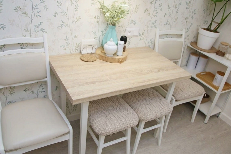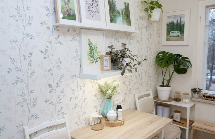 Напротив получилась отдельная обеденная зона + полочки для цветов и небольшая этажерка для мелочей.