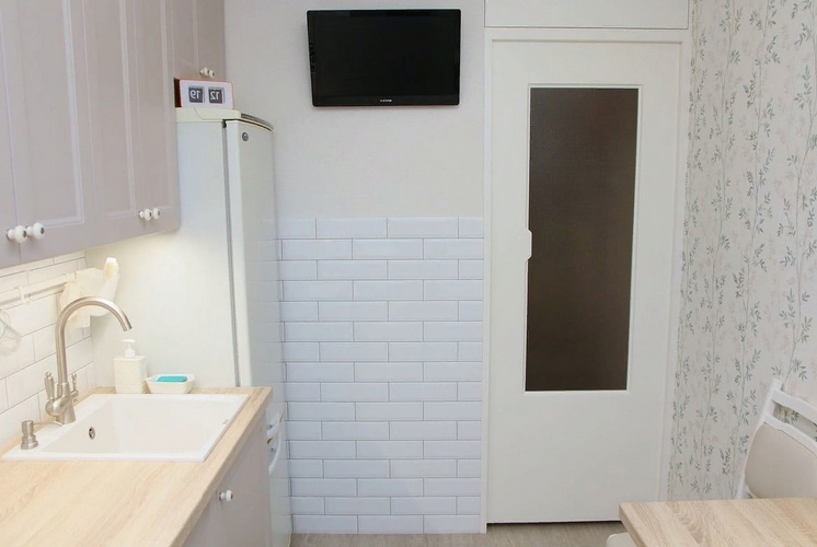 Дверь просто покрасили белой краской на водной основе, заменили обналичку и сделали дверку в нишу на верху, где висела шторка.