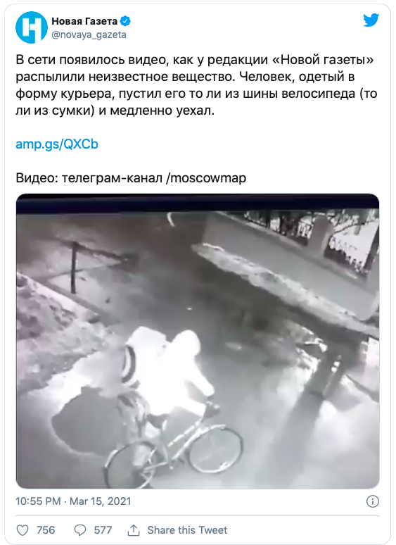 Фальшивый курьер и ядовитый газ прямо на входе в здание, где уже как 25 лет располагается редакция "Новой газеты" на арендуемых площадях... Каков замысел этого "курьера"? Чтобы сотрудники редакции на своих подошвах разнесли отраву по всем этажам, когда пройдут через место распыления неизвестного вещества?