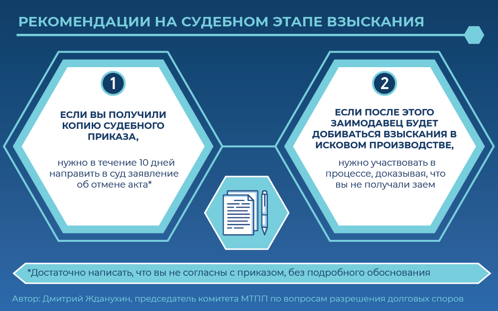 Как видно, с «чужими» долгами можно и нужно бороться. Есть хорошие шансы добиться своего. В этом на своем опыте убедился Роман Нагучев, чьей историей начинается статья. Комментатор отправил заявление об отмене судебного приказа, написал в Бюро кредитных историй и позвонил в «Займер». После этого ему прислали письмо из МФО. Организация признала, что Нагучев не получал заем, и попросила БКИ удалить эту информацию из его кредитной истории. Хэппи-энд был и у истории Леонида Волкова. Запись о «его» долге исчезла после писем в БКИ и ООО «Деньги Взаймы». А вот предпринимателю Алексею для этого пришлось дойти до суда, но итог был тот же – «очищенная» кредитная история.