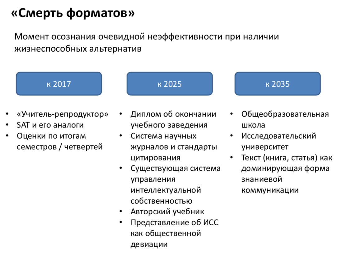 Дипломов об образовании не будет! Систем научных журналов не будет! То есть общепризнанные ценности из СССР в системе нашего образования, которые еще имеют место быть, будут упразднены к 2035 году полностью! Потому что в концепции образования 2030 провозглашено, что действующая система образования не эффективна и будет упразднена в указанный выше срок.