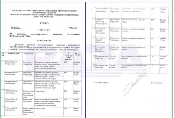 В минувшем январе Сергея Папиянца назначили исполняющим обязанности главврача Московской областной станции скорой помощи. Новый руководитель, видимо, быстро вошёл в курс дела, потому что уже 19 февраля он издал приказ о премировании самого себя и четырёх своих заместителей.