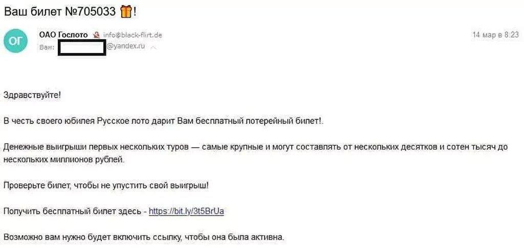 В качестве отправителя была указана компания "ОАО Гослото". Ни один из крупных интернет-поисковиков не позволил найти какие-либо сведения о ней: запрос выдает данные только о крупнейших официальных лотерейных организациях. При этом в самом тексте письма компания названа уже по-другому — "Русское лото", а сообщения пришли с адресов, позволяющих предположить, что их отправили мошенники: office@unblockit.top, office@btcbay.net и info@black-flirt.de.