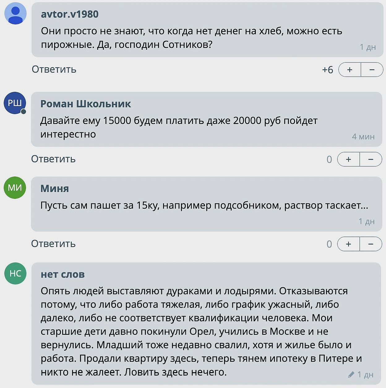 Вот они нынешние, обнаглевшие напрочь!-"слуги народа!" Одна "макарошками" предлагает питаться, другой удивляется, что за 15 тыс не хотят работать! Так надо на них и провести эксперимент! Назначить ИМ! эти пресловутые 15 тысяч! Кто согласится пойти на такой оклад из ныне высиживающих по кабинетам!? Предлагаю провести всероссийский опрос - КТО ЗА, ЧТОБЫ ЧИНОВНИКИ ПОЛУЧАЛИ 15 000!? Думается даже нашлись бы волонтеры, на проведение подобного опроса бесплатно!