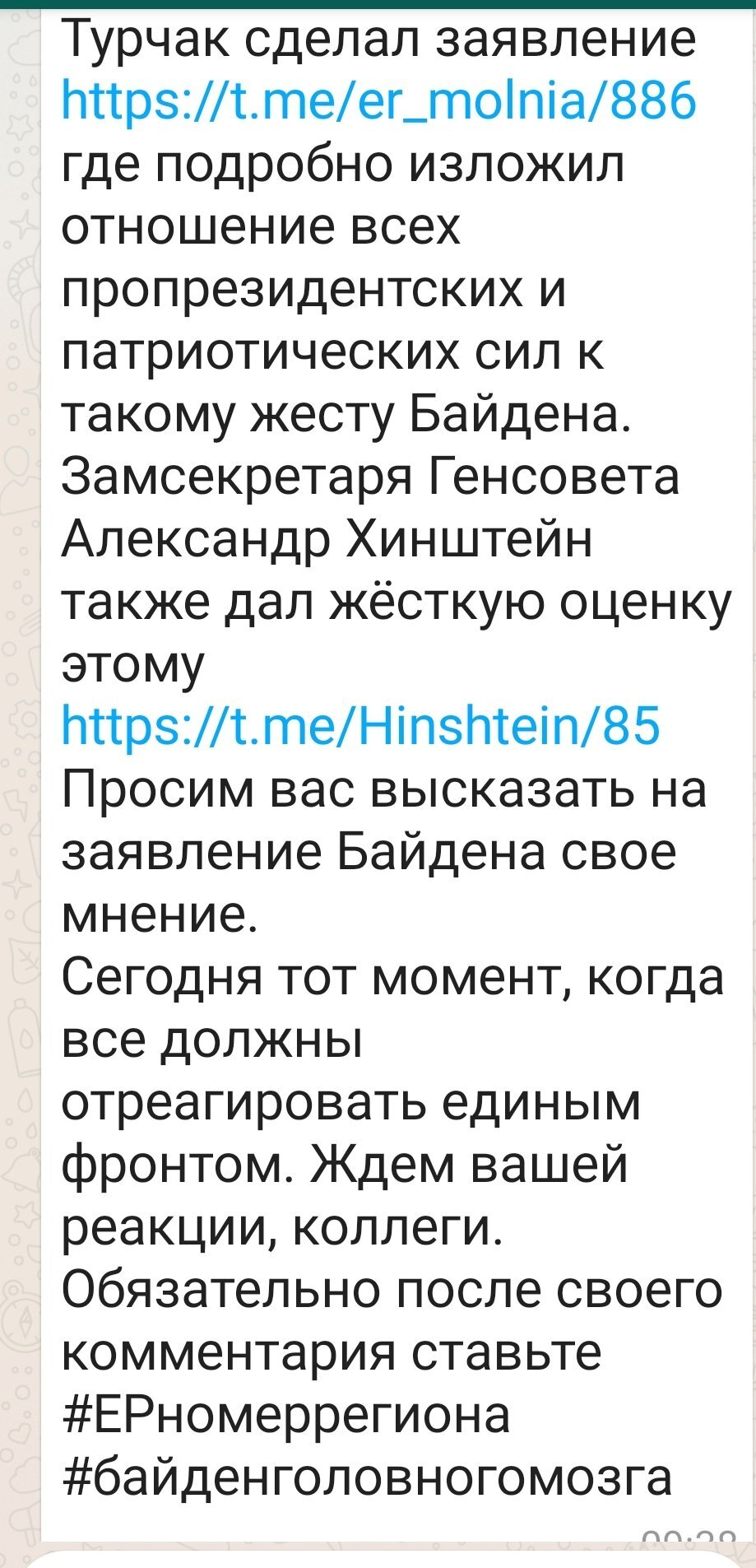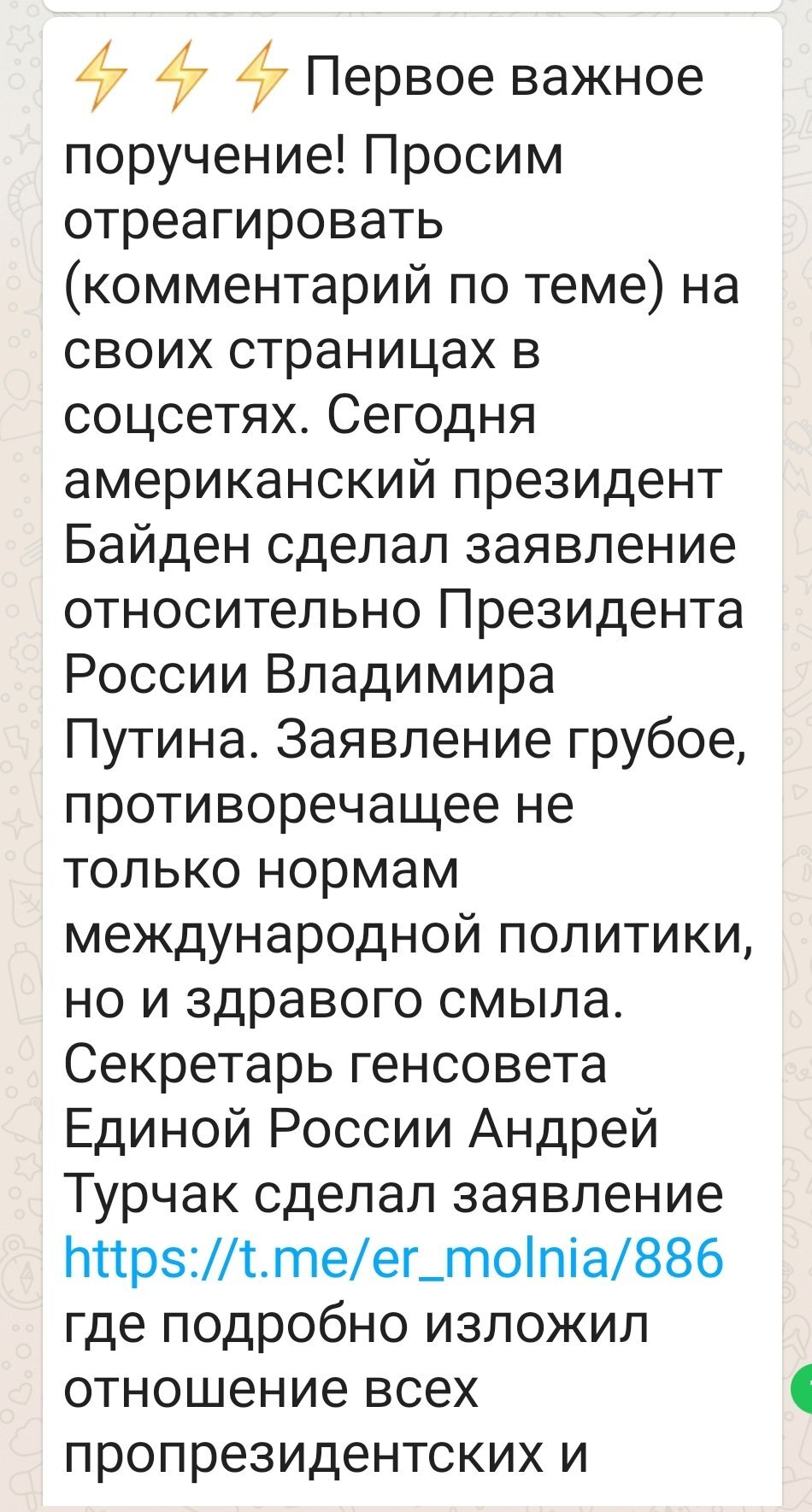 Вот, например: едва успел Байден проскрипеть своё не шибко ласкающее слух высказывание в адрес российского Президента, как в аккаунты социальных сетей региональных отделений правящей партии полетело "первое важное поручение" - прямо как во времена СССР циркуляры с руководящими указаниями ЦК КПСС в партийные ячейки всяческих Крыжоплей: