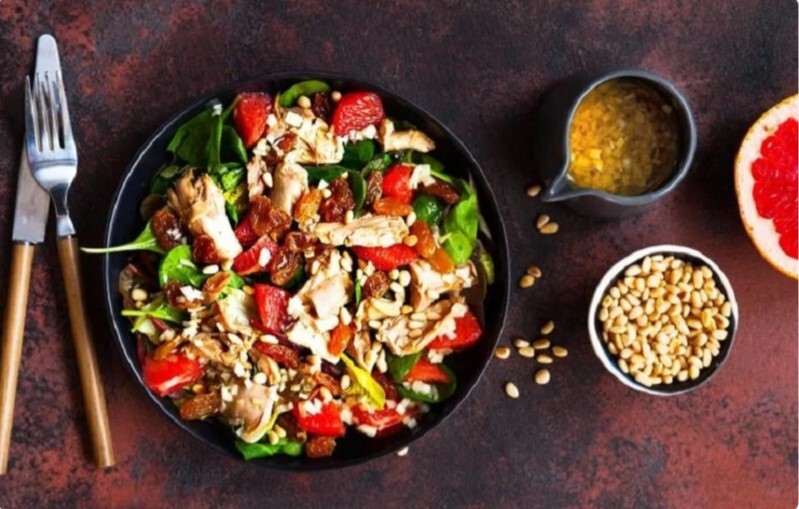 В салатник или в глубокое блюдо выложить салатные листья, предварительно их, вымыв и обсушив на бумажном полотенце. Сверху выложить нарезанную курицу, грейпфрут, изюм. Полить салат заправкой из апельсинового сока, перемешать. Сверху посыпать салат кедровыми орешками, немного поджарив их на сухой сковороде, чтобы они приобрели приятный золотистый цвет.