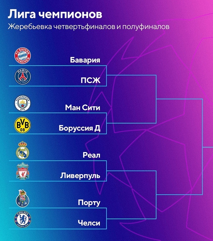 Определился путь оставшихся 8 команд Лиги чемпионов по футболу, пожалуй, лучшего европейского спортивного турнира. Ниже представлена сетка: