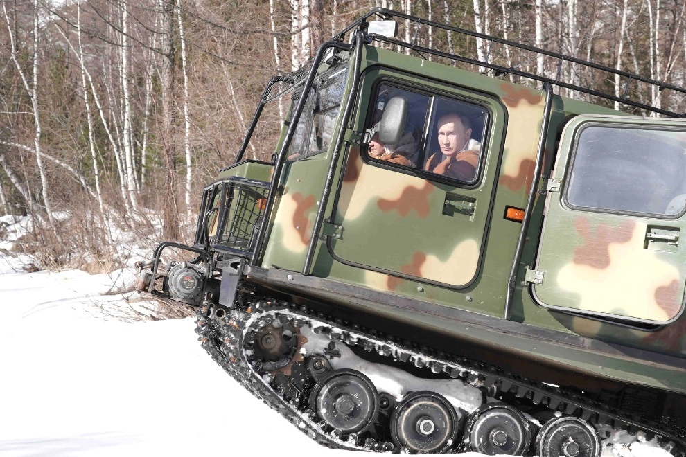 Путин и Шойгу прокатились на вездеходе. На одной из фотографий видно, что за рулем Шойгу, на других машиной управляет уже сам Путин.