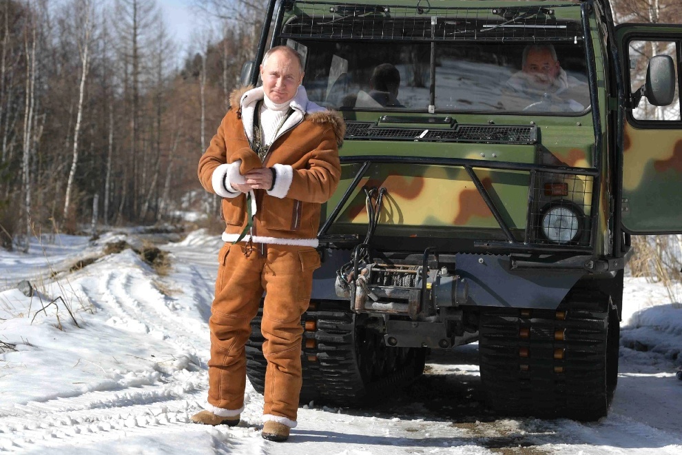 В поездку Путин и Шойгу надели костюмы-дубленки и унты, пишет ТАСС. Путин перед посадкой за руль стряхивал с обуви снег.