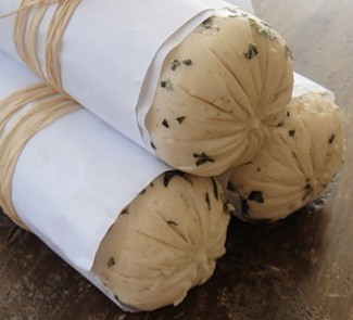Снять пленку. На столе расстелить кусок пергаментной бумаги, посыпать любыми сушеными травами (например, базиликом и укропом). Положить на зелень колбаску и завернуть. Поверхность должна оказаться равномерно покрытой обсыпкой. Повторить эту процедуру с каждой колбаской. Убрать в холодильник на 8-10 часов. Перед подачей снять бумагу и нарезать тонкими ломтиками.