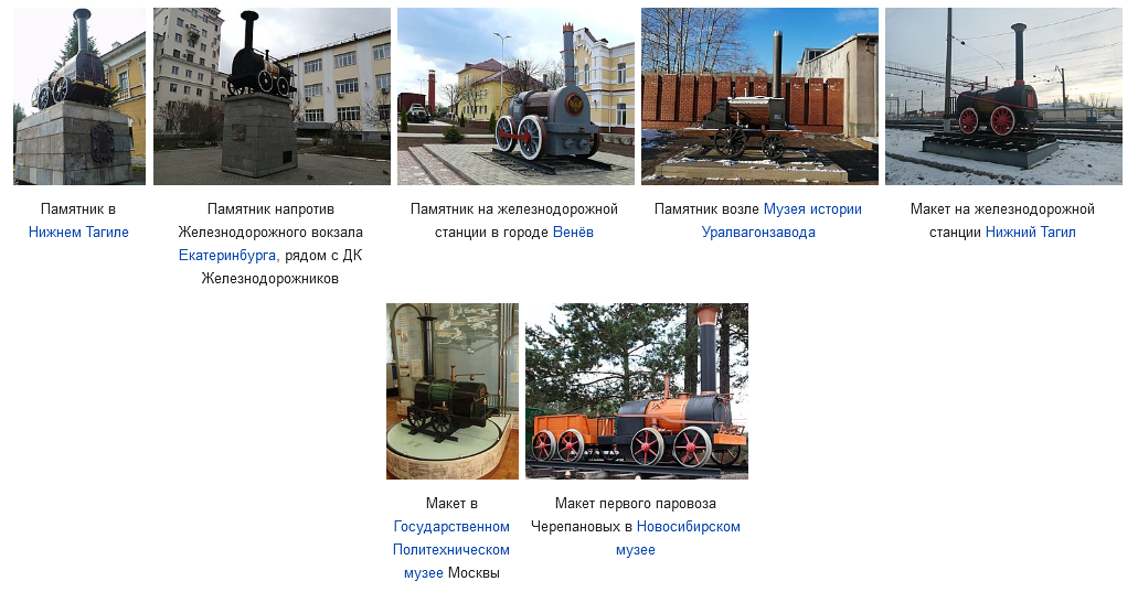 Памятник Черепановым стоит на центральной площади города Нижнего Тагила, а также в Уральском Государственном Университете Путей Сообщения (Екатеринбург) и на конечной станции Детской Железной Дороги в городе Кемерово.