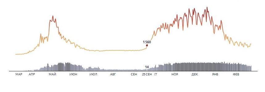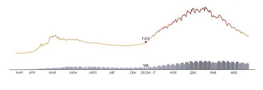 1-я причина. Политическая. 24 сентября 2020 г. президент Путин на встрече с вновь избранными (выборы прошли, можно и вспомнить про ковид) главами регионов заявил: «Но не прошла ещё, полностью не завершена, далеко не завершена работа, связанная с борьбой с COVID‑19». Буквально через день график (см. графики 4 и 5), колебавшийся вокруг горизонтальной прямой (дна), резко пошёл вверх: 25 сентября в Москве выявлено 1560 случаев заражения против 970 (рост на 60%), выявленных 23 сентября, а в целом по России – 7212 против 6431 (регионы отстают по росту от Москвы по вышеуказанным причинам). Если б имело место эпидемиологическая этиология, то ещё не позже чем с середины августа начался бы рост заболеваемости в Крыму и Краснодарском крае ввиду массового приезда и перемещения отдыхающих и уж если не на уровне Москвы, то по крайне мере на уровне Московской области точно!