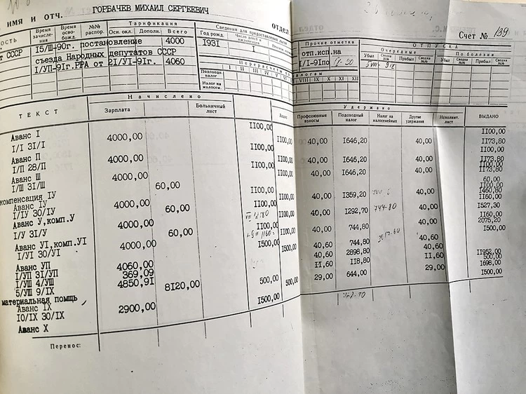 Зарплатная ведомость Михаила Горбачева за 1991 год, из которой видно, сколько он получал на руки, какую матпомощь выплатили перед отпуском в августе... Фото: Копия документа предоставлена Российским госархивом новейшей истории (РГАНИ)