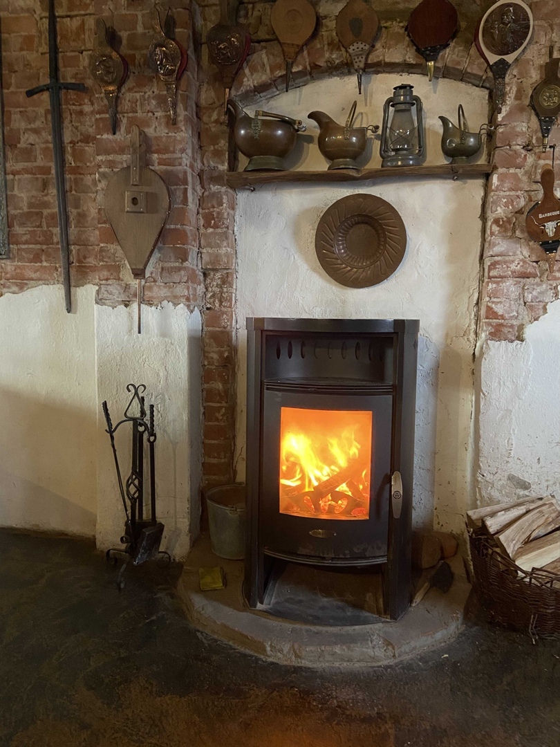 Не могу сказать о таверне, о внутреннем очень аутентичном антураже. Там нет отопления и все тепло от нескольких обогревателей и настоящей печи с реальным горящим огнём, с запахом сгораемых дров, с лавками, покрытыми шкурами, большими деревянными столами. На улице было ветрено, холодно, моросил дождь, поэтому выпить чашечку кофе с яблочным пирогом у огня было ах как здорово.