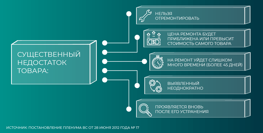 Для этого, по мнению коллегии, расходы на ремонт должны быть почти как цена мобильного (дело № 46-КГ 19-5). Но встречаются и другие подходы в практике. Четвертый кассационный суд общей юрисдикции решил, что затраты на устранение дефекта в размере 60% от стоимости товара являются признаками существенности (дело № 88-2021/2020).