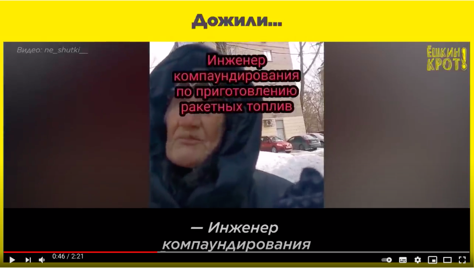 У бабули набор слов, конечно, набор слов чуть более обширный нежели у Эллочки. Обозленая старуха, проработавшая по ее словам 45 лет на вредном, как я поняла, производстве, связанном с компонентами полимеров и пр.химических составов, а вот пенсия маленькая, видимо. Но только откуда она столь посвящена в личную жизнь Путина? Лгунья с психически искаженным своим взглядом на жизнь. Даже не лгунья, а в ней скорее проявляется этакий старческий синдром "всезнайки" и сплетницы. Такие старики всех готовы облить грязью, сидя на скамеечке у подъезда. Я не поверила ей ни на йоту по поводу ее знаний, а злоба на ее лице явная: исполосовала все лицо глубокими морщинами. Отвратительный персонаж.