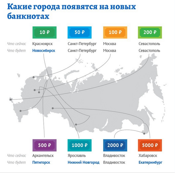 Изменению подлежит не только дизайн, но и изображения на новых банкнотах. На каждой из них будет изображен город, символизирующий один из федеральных округов (их в России как раз восемь). На лицевой стороне будет главная достопримечательность города, а на оборотной – одно из примечательных мест округа. Это значит, что часть существующих городов исчезнут с наличных денег. К примеру, вместо Хабаровска самую крупную банкноту отдадут Екатеринбургу.