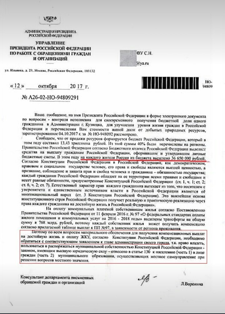 Ваше. сообщение, на имя Президента Российской Федерации в форме электронного документа по вопросам контроля исполнения для своевременного получения бюджетной доли одного гражданина в Администрации г. Кузнецка. Для улучшения уровня жизни граждан в Российской Федерации и перечисления Вам стоимости Вашей доли от добытых природных ресурсов, зарегистрированное 04.10.2017 г. за № Н 0-948092 рассмотрено.