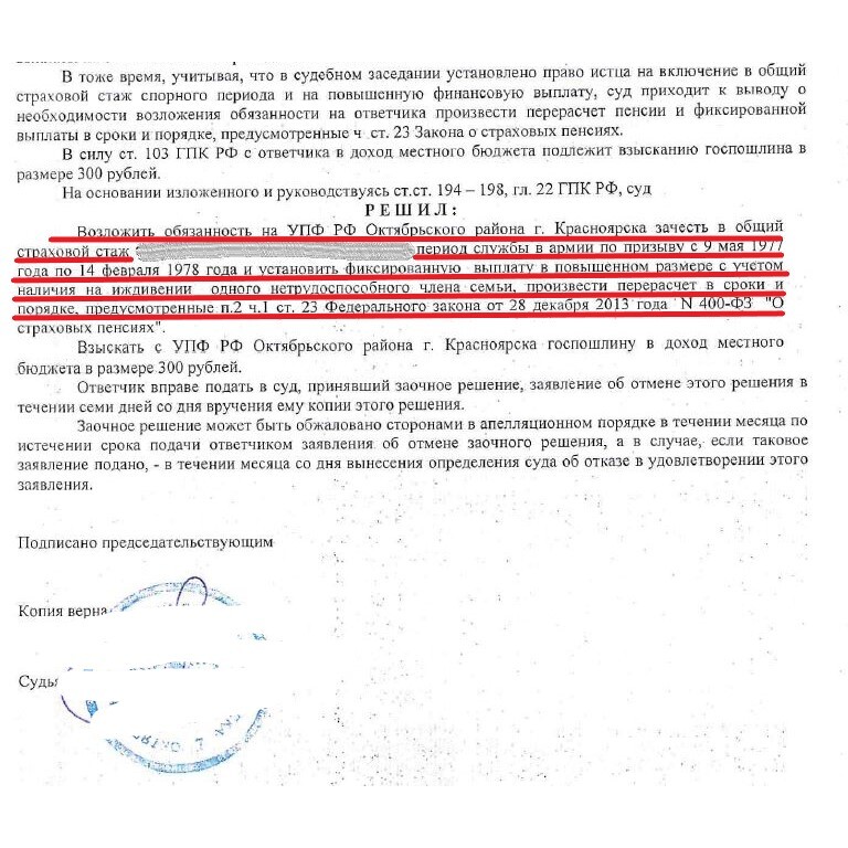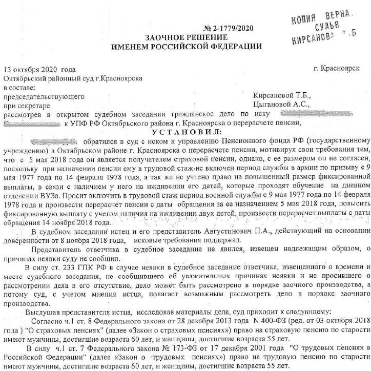 И напоследок, положительное решение по перерасчету пенсии. К нам обратился мужчина, которому УПФР не включил в трудовой стаж период службы в Вооруженных силах и отказал в доплате за иждивенцев. Рассмотрев наши доводы и представленные доказательства, уважаемый суд, к счастью, решил удовлетворить исковые требования (Октябрьский районный суд, дело № 2-1779/2020).