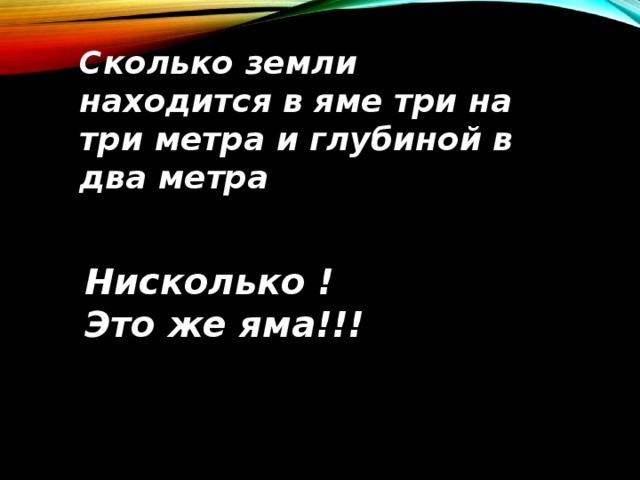 Однако, не все так просто. В подобных задачах всегда есть подтекст. Думаю, что раз речь идет о яме, то земли в ней нет. Поэтому правильный ответ 0 м 3.