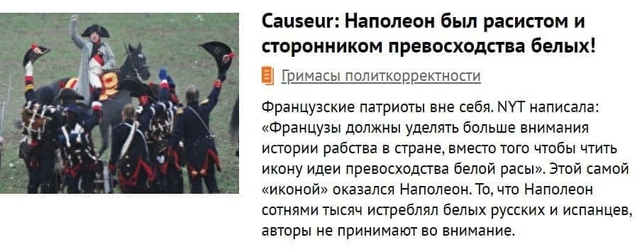 CША советуют Франции не отмечать двухсотлетие со дня смерти Наполеона. Отказаться от памятных мероприятий порекомендовали в Виргинском университете. Там императора назвали расистом. И заявили, что Франция не ведет, а должна бы вести борьбу с "наследием колонизаторов", статья об этом вышла на страницах NYT.