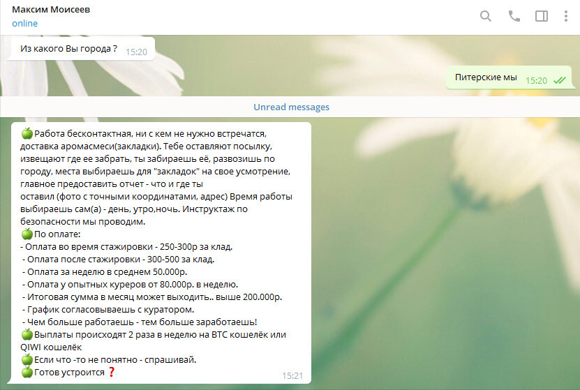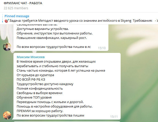 Это невинное сообщение я нашел в ленте группы телеграма, предлагающей вакансии на фрилансе. Таких групп в "телеге" много, стоит ввести в поисковой строке приложения "ищу работу", "поиск работы", или что-то подобное. Связываешься с автором вакансии - и он в личной переписке озвучивает тебе условия.